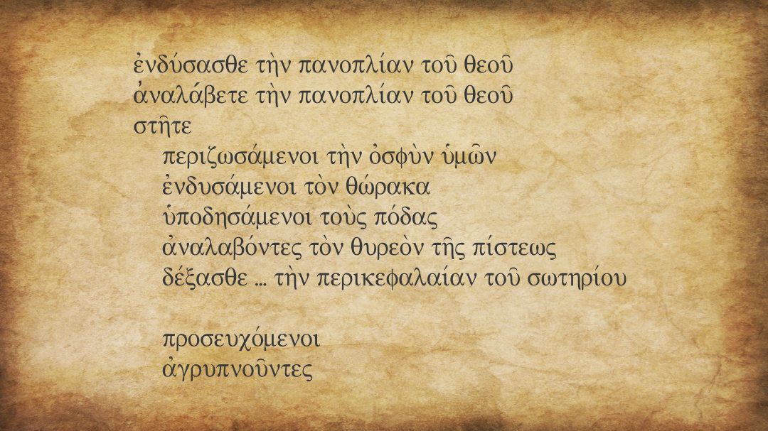 Paul encourages us to “put on (ἐνδύσασθε) the full armor of God” (v 11), and again to take up (ἀναλάβετε) the full armor of God (v 13). The third imperative στῆτε tells us to “stand,” and then he follows with a series of participles telling us how to do this.