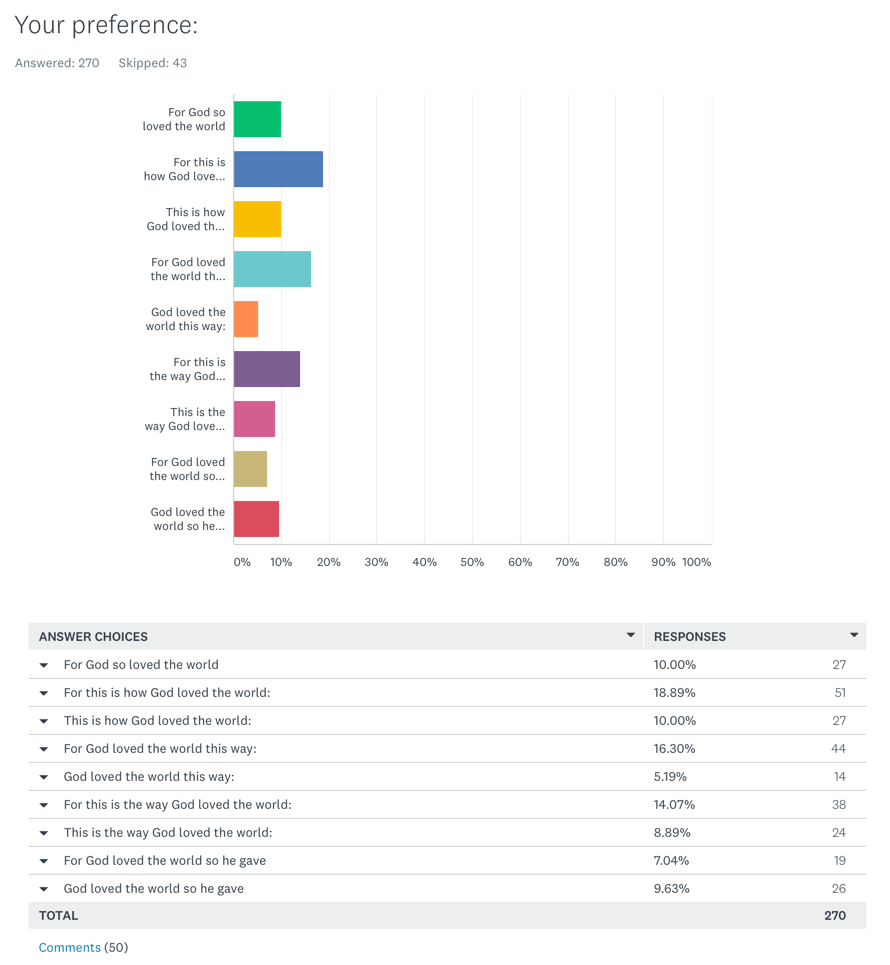 Thanks for everyone who responded to my poll last week about how to properly translate John 3:16. I am still working through all the comments, but here are the basic results of the poll. It appears you like the γάρ translated (somehow), and you like clarity even at the expense of readability.