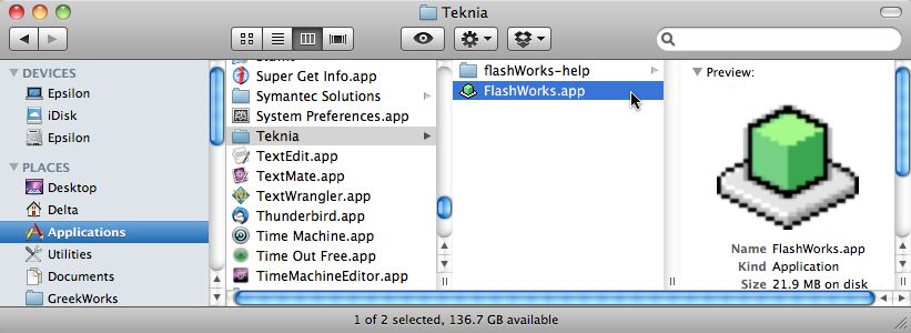 The application should be in Applications/Teknia, and the data in Documents/Teknia/FlashWorks.