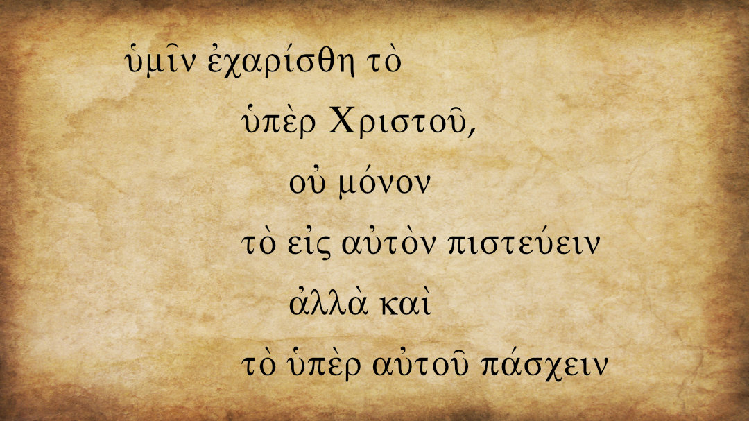 Secondly, the awkward Greek. I am speculating at this point, but it appears that Paul changed his mind mid-stream, as evidenced by the extra τό. Apparently, Paul was going to say, “to you it has been graciously given on behalf of Christ to suffer for him” (ἐχαρίσθη τὸ ὑπὲρ Χριστοῦ ὑπὲρ αὐτοῦ πάσχειν; cf. 1 Thess 2:2; Phil 1:30). τὸ … πάσχειν is an articular infinitive modified by two prepositional phrases, ὑπὲρ Χριστοῦ and εἰς αὐτόν. However, it seems that Paul changed his mind, probably because he wanted to encourage them at the same time and so decided to add the phrase about God’s gracious gift of faith. It would have been nice if Paul’s amanuensis had scrapped the τό off the parchment, but he didn’t.