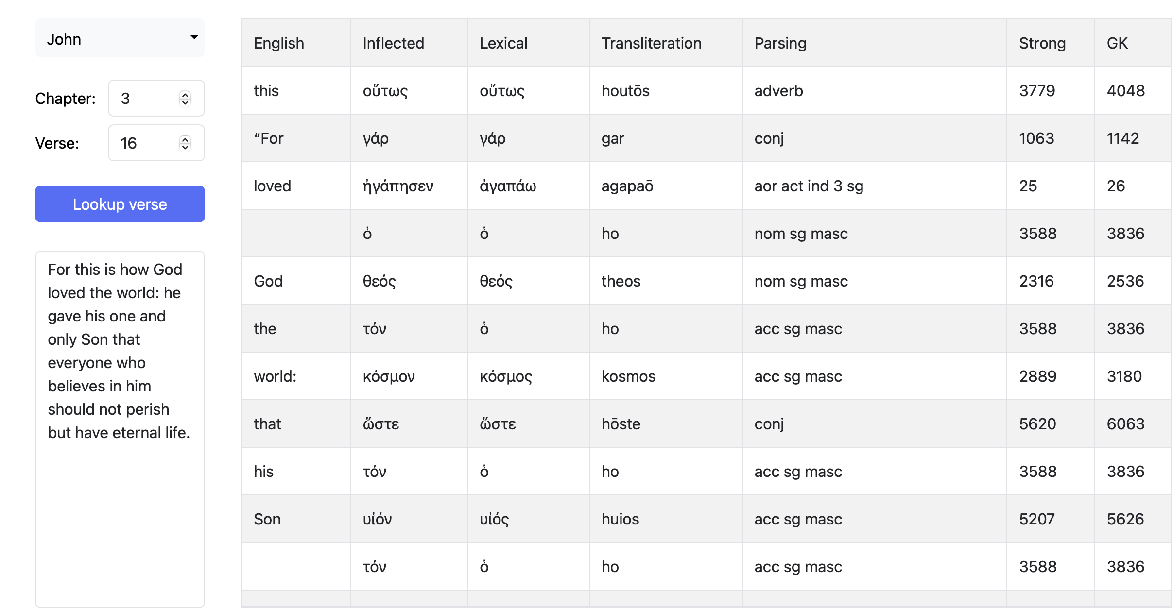 Traditional interlinears, NASB/NIV, NIV/KJV, and TNIV/NLT, with a new Greek text, new interlinear translation, parsing, and Goodrich/Kohlenberger number for each word; Contains a Greek/English Dictionary.