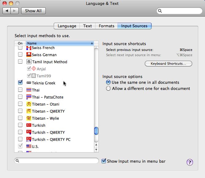 Language & Text, click on Input Sources, and check the TekniaGreek layout checkbox.