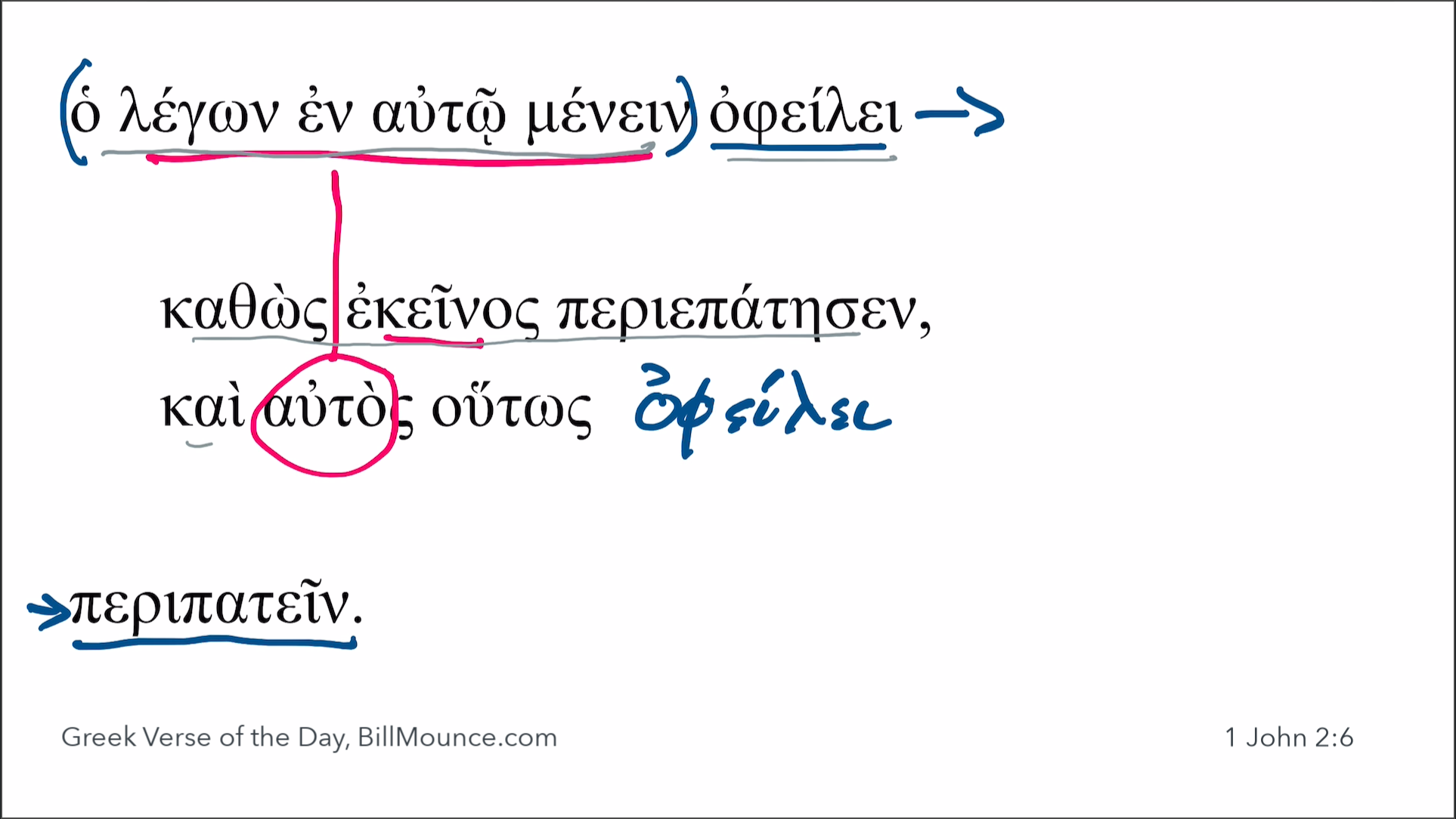 The trick in our verse is first of all to find the main verb. There are two indicative verbs, ὀφείλει and περιεπάτησεν. Next, find the subject of each. The subject of περιεπάτησεν is easy to identify: ἐκεῖνος. The subject of ὀφείλει is the participial phrase ὁ λέγων ἐν αὐτῷ μένειν, the infinitive, completing the thought of the participle.