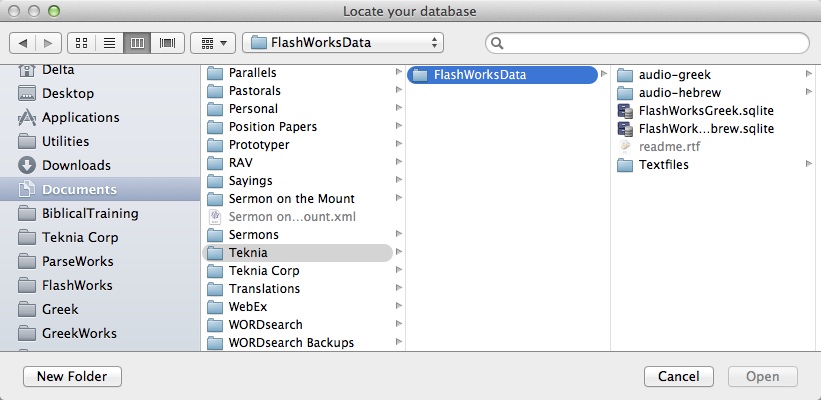 When you start FlashWorks for the first time, you need to tell it where the database is. It is in your Documents > Teknia > FlashWorksData directory/folder.